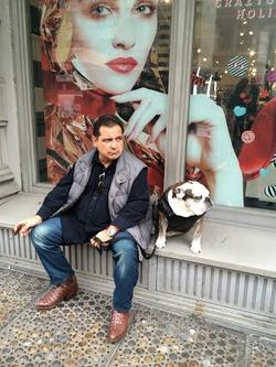I asked the man the dog's name: Brutus. Brutus is darling and let me pet him. I then spontaneously asked the man if I could take their picture. How could I resist this man and dog pair? And the setting: the fact that they were sitting directly under the huge make-up ad in the window of Sephora made it all the more "interesting!"