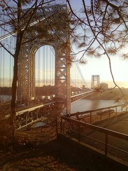 I have recently began commuting by bike into the city from New Jersey. The George Washington Bridge is always such a pleasure to cross and a dramatic entrance into Manhattan. This was taken one chilly morning from Fort Lee Park, overlooking the bridge. The bridge is crowded with cars. My solitary bike is in the foreground.