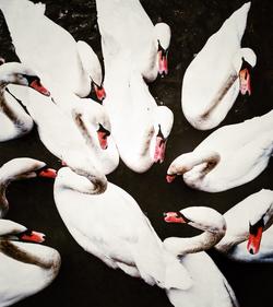 Swans take some photogenic beating. Beautiful lines, pure white, a splash of color. They are the coolest bird. I took this on Geneva lake and I liked the repetition of those curvacious lines the high contrast of white feather against dark lake.