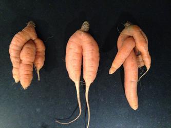Shopping at a farmer's market in September, these carrots were the only ones left at this particular stand—no one wanted funny-looking carrots. As I handed over the money, the nice person at the stall told me that they were her favorites. I think she might have been pleased to take them home herself, if I hadn't been instantly attracted to them. I immediately took this picture in the kitchen, but I couldn't bring myself to cook them for about 3 weeks. (They were delicious.)
