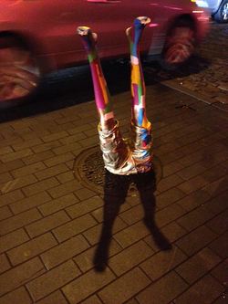 An odd pair of colorful legs were sticking up seemingly out of a manhole cover on Mercer St. in Soho. As soon as I snapped the photo the artist ran out and posed with a painting and asked for a contribution or purchase of his art. Clever salesman.