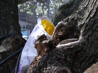 This callery pear tree, also known as the Survivor Tree, was recovered from the rubble of the 9/11 attacks on the World Trade Center and replanted. In 2011, Hurricane Irene uprooted it, but it was replanted and once again survived. On the day I visited the 9/11 Memorial, someone brought this beautiful bouquet and placed it in the tree's bough. It looked to me like the tree and the gift were embracing.