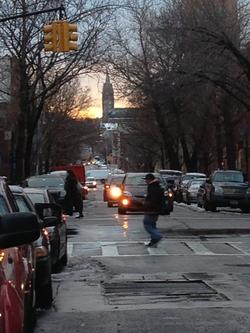 I have been taking many images of this church from a street here in Park Slope, Brooklyn and the activity and seasons that surrounds it. I am entering this image because I was inordinately attracted to the pointed triangulation of the steeple as a focal point and pace of humanity below. I like how the moment captures the darker mood of daily life and the beauty of the sun setting behind the church.