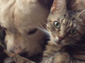Woke up one morning and saw the two of them cuddled up and took the shot. Cat thinks the pup is its mom (male dog) and she just takes charge while he sort of helplessly goes along, giving me long suffering looks. Love the way they're at peace with each other.