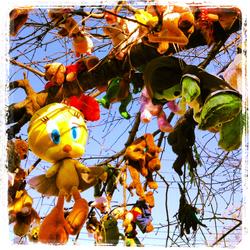 The second image is of a tree in the Bergen Beach neighborhood of Brooklyn. It is a tree covered w/ stuffed animals.