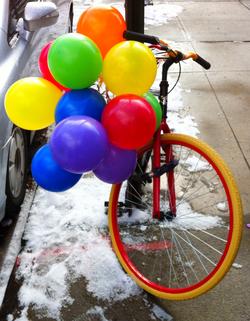 A resident bicycle of my Park Slope neighborhood its a fine bike that I've photographed before, with its black frame and colorful wheels. This day, I passed by, noticing that while it was missing its back wheel, it was instead sporting a festive bouquet of balloons that its owner chose to leave attached during its respite.
