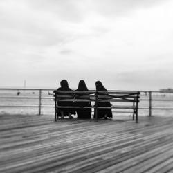 I took this photo using my cell phone camera at Coney Island on a cold autumn day. I took it because I saw the three women in their burkas arranged so symmetrically on the bench. I tried to come up from behind to not get their attention, but one heard me and turned around. I now think her figure breaking the pattern makes the photo what it is. I like how the women look so out of place yet perfectly in tune with the sky and beach in front of them.