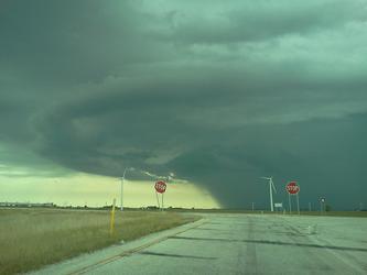 This photo was taken outside of Lafayette, IN along I-65. The elements of the photo -- the stop signs, the windmills, the flattened landscape, the marred road, the swirling storm cloud -- are perfect indicators of the American roadside; at once in constant motion and in a state of perpetual still sameness.