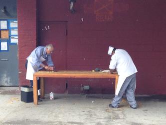 This past October, a friend and I were on the Chelsea Market NYC Food Tour when we made our way to Little West 12th Street for our last tasting. There we spotted these men hard at work stripping the top of a table. It seemed ironic to capture what is left of laboring men in the meatpacking district.