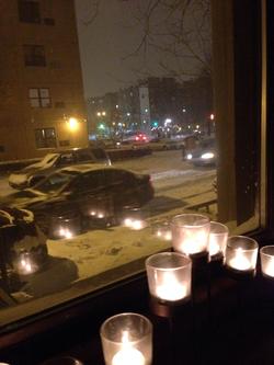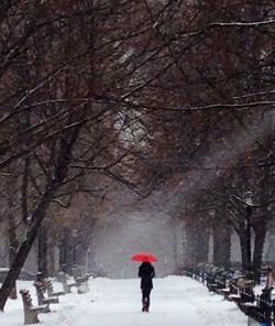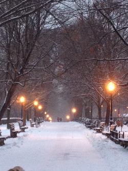 I have had a nearly four-decade-long passionate love affair with Riverside Park, so I snap photos nonstop when I'm out with my dog. This was on Tuesday, December 10, after the snow had stopped. It was not yet, dusk, but the lights along Riverside were on, and in the distance I saw people approaching. I snapped about 20 photos, because the landscape looked like a Monet painting: blue sky, dark, bare trees, benches, iron, and the yellow in those old-fashioned lamps that line Riverside that I adore. I thought his was the best.