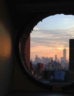 An early December sunset over downtown Manhattan, viewed through a circular window at The New School's Arnhold Hall.