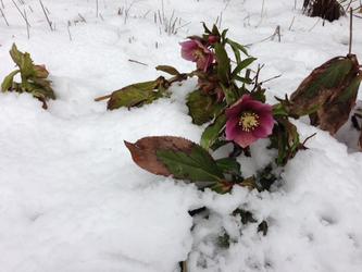 This is a photo of a Helleborus plant in bloom peeking through the snow. It was taken in my garden and I love the fact that there are flowering plants in the middle of winter.