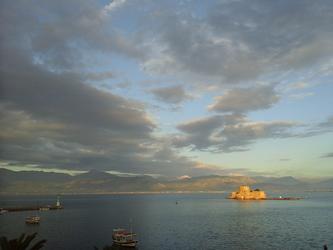 Was visitin Nafplio, Greece and spent the money to get a room with a view. This was taken one morning as the sun was coming up and I was on balcony with my coffee. I have many shots of the same view all with different lighting on the water and mountains.