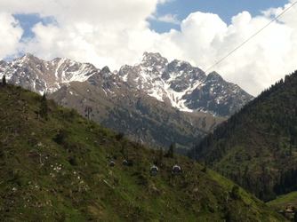 Cable cars gliding to and from the Chimbulak ski resort in the snow-capped ranges of the Trans-Ili Alatau mountains surrounding Almaty, Kazakhstan, May 28th, 2014