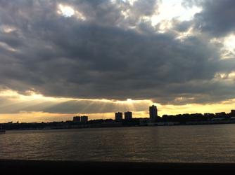 Rays of sunlight stubbornly breaking through ominous storm clouds, August 10th, Riverside Park South, New York