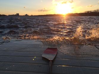 This picture is taken on Overpeck Lake in Bergen County, NJ. The lake is surrounded by the New Overpeck County Park. I was out for my exercise in my rowing shell when the wind started to come up very strongly. As I came back to the dock I took this picture of the wind pushing the water against the dock as the sun was setting. In the foreground you see the blade of my oar.