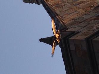 I took this photo on my walk to work near the University of Michigan Law Quad in Ann Arbor, MI. This beautiful bird (maybe a Red Tail?) was perched on the roof and flew right at me. It's a little unfocused but still very cool.