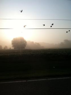 I took this while on my way to work. The photo was taken early in the morning in northeast Ohio. I like the way the fog looked with the morning rays. The birds flying away was a bonus.