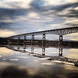 Taken from an Amtrak train window along the Hudson River (heading north from NYC to Hudson, NY). The view from the train was beautiful throughout the trip, but the reflected symmetry of this bridge stood out to me the most.