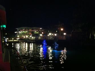 We were supposed to fly home from Florida on Saturday December 14 but the flight was cancelled because of bad weather in the Northeast. Instead of going home, we got invited to take part in the boat parade in Key Largo bay on Saturday evening--this is a photo of paddle boarders decked out in lights for the parade.