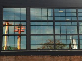Riding my bike through Williamsburg one afternoon, caught this reflection of a construction site in the window of a factory building. The new Billburg overlapping the old.
