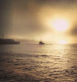 We live on the Jersey Shore. this picture is of the Manasquan Inlet on a cold spring day. The sunset was strange, the yellow glow through the clouds gave it a strange perspective. A commercial fishing boat is coming back to port.
