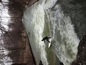 I was walking through downtown Munich, crossing a bridge at the edge of a park when I realized that guys were surfing.
