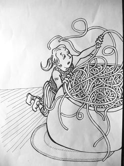 What to say...she appears to be having a conflict with the pasta! I do know the "W" tattoo stands for her new grandson, Weston.