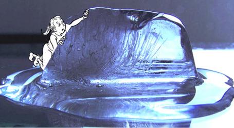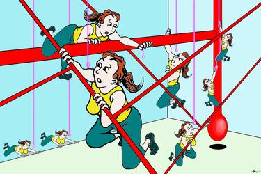 "At first I thought that she was hanging off of a cliff, but then I saw how her toes were turned under so I imagined that she was working hard on her car and her is checking to see if she's done yet."