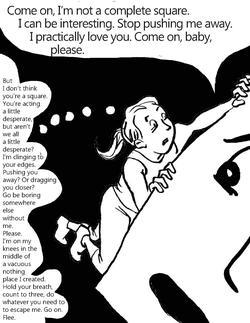 The idea is the struggle of a young, creative woman trying to climb out of the established, school-taught library of male American authors... the books are dangerously heavy and haphazardly piled - it's scary and takes courage and ingenuity.