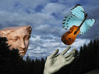 My first idea was to put the wings on the guitar. Then, I wanted a story. So, I added the woman letting go of the guitarfly. She is content letting it go.