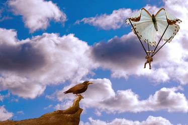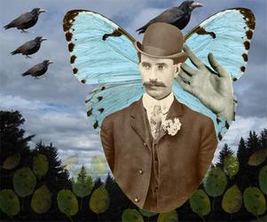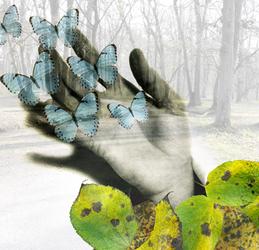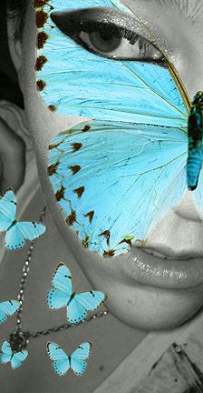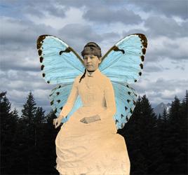 I simply cut the blank spots surrounding the butterfly and lady using Photoshop, then put the trees layer in the back, then put the butterfly in the center, and put the lady in front, making it look like she has wings.