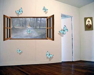 Although abandoned, this empty room is home for the ghost visible through the open window. The butterflies announcing her arrival suggest a sort of rebirth underway.