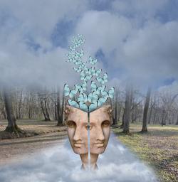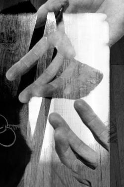 I layered the hand image with an image of my dog and shadows of chair legs on my dining room floor.I used a variety of black and white filter adjustments along with several blending modes in Photoshop CS5.