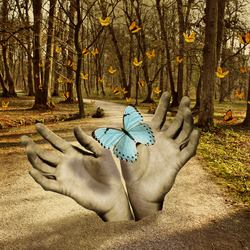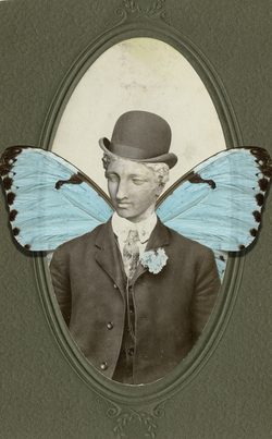 I decided for this that less is more and only used three of the ten images provided. The woman in white is obviously an old/antique photograph, so I decided to erase her eyes. In other cultures through out history, it is known that when somebody has passed away you put something special (gold, coins, etc) on their eyes for them to bring into the afterlife. When this photo was taken, the woman in white was alive, but not anymore. I decided to put the butterflies in her eyes to symbolize something beautiful, but also something that is full of life as she was when this was taken. I was also very inspired by the hand and the fact that it already looked as though it was ripping through the paper. The hand is ripping through the photograph, and the image is caught right before he wraps his hand around her and takes her away.
