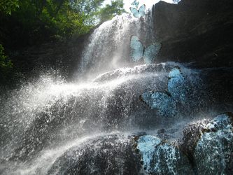 The butterfly is shown descending the waterfall toward the viewer and as the descent progresses, becomes a part of the waterfall itself.