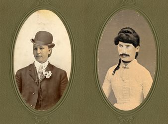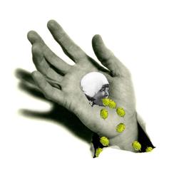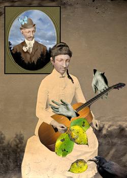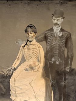 I used the Hand, Man in Hat, and Girl in a White Dress images. In Photoshop, I manipulated images I had of skeletons, a picture locket, and a man in a suit to have the same color & feel of the original pictures. I superimposed the original Man into the same picture with the Girl and gave him a complete body. I changed the Girl's hand and added a locket with the picture of the Man. I adjusted layer opacity to create an x-ray feeling.