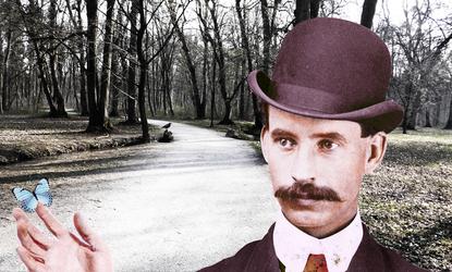 For this one I used only the provided elements. First, with the same hand I colorized for my previous submission, "New Holy Trinity" and the man I colored by the same process described in the notes of that piece. For his suit and hat I adjust color, hue and saturation until I had what I wanted. The tie is made composed of one of the leaves with it's hue and saturation adapted. I choose the path for a background and began heightening the contrast while lowering the saturation to all of the elements in turns until I had a balance. I added the butterfly early on but later added the bird to echo the subtle tension of the possibility that the butterfly and bird may take off at any moment or movement by the man.