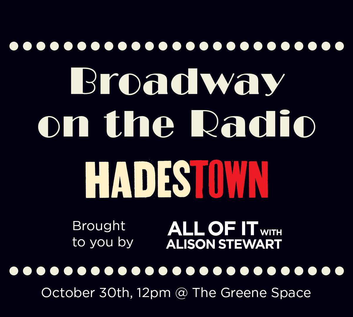 The new cast from Broadway's Hadestown joins Alison Stewart live in The Greene Space. Lead actors Morgan Dudley, Kurt Elling, Rebecca Naomi Jones, Paulo Szot, and Jack Wolfe perform songs from the show and discuss stepping into the principal roles of the long-running Broadway hit. This event is part of All Of It's Broadway on the Radio series.