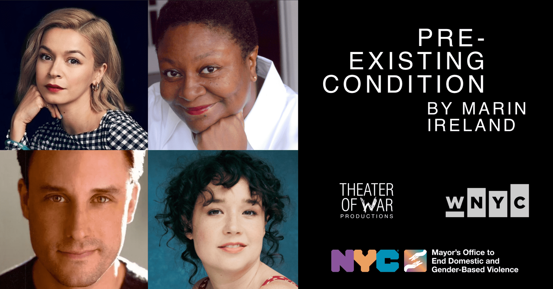 Please join us on October 30th at 7 PM for dramatic reading of Marin Ireland's Pre-Existing Condition —a play exploring the challenges, shared community, and everyday indignities of learning to move forward after a life-altering, harmful relationship—as a catalyst for a powerful, guided audience discussion about domestic and intimate partner violence grounded in the perspectives of victims and survivors. Featuring performances by Julia Chan (Uncle Vanya), Sarah Steele (The Good Fight), Myra Lucretia Taylor (American Fiction), and Greg Keller (Blue Bloods). This event is a collaboration with the NYC Mayor’s Office to End Domestic and Gender-Based Violence in honor of Domestic Violence Awareness Month. Directed by Maria Dizzia Facilitated by Bryan Doerries Presented by Theater of War Productions, WNYC, and Chase This Productions.
