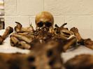 There's an open box of skulls on the floor. A table is covered with pelvis bones. Nearby: a pile of ribs, tied up with a piece of string.