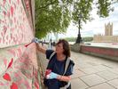 Volunteers have painted more than 150,000 red hearts on a wall along the River Thames and people stop to write messages and names of lost loved ones inside the hearts.