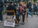 On a gusty Friday evening in Manhattan's Union Square Park, Francisco Ramirez is setting up his chairs and a big sign that yells, "FREE ADVICE."