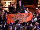 Activists targeted New York City Mayor Bill de Blasio regarding the NYPD officer involved in Eric Garner's 2014 death. Another group held a banner that read, "Stop all deportations on day one."