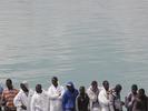 On a rocky beach in North Africa, a chain link fence juts out into the Mediterranean Sea.