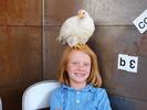 Some of the chickens perform tricks — one pale-feathered rooster named Bruce pretends to sleep on command — while others, like Buff Brahma hen Miss Felicia Fancy Feet, don dapper costumes.