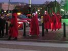 One year after his contentious confirmation battle, protesters outside Justice Brett Kavanaugh's speech played Christine Blasey Ford's testimony on a large video screen.