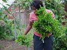 In a garden filled with flowers and beds bursting with vegetables and herbs, nearly a dozen teenagers are harvesting vegetables for the weekend's farmers market.