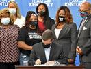 Kentucky Gov. Andy Beshear signed the partial ban on no-knock warrants at a ceremony on Friday as members of Taylor's family looked on.