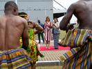 The first lady was greeted by dancers, drummers, children waving flags and the first lady of Ghana, getting red-carpet treatment on her first trip overseas without the president.